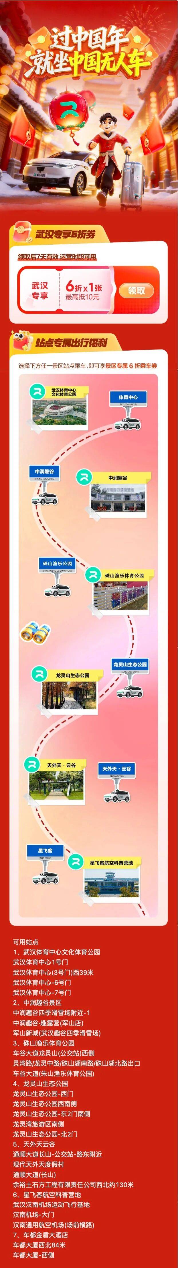 为方便游客规划行程,活动主办方特别发布出行提示:星飞客航空科普营地将于2月15日至23日闭园,武汉车都金盾大酒店派瑞阁餐厅也将在同期暂停营业,建议游客合理安排时间,避开闭园时段。同时,春节期间人流较大,游客乘坐自动驾驶汽车时需遵守乘车规范,游玩期间做好个人防护,确保文明、安全出行。