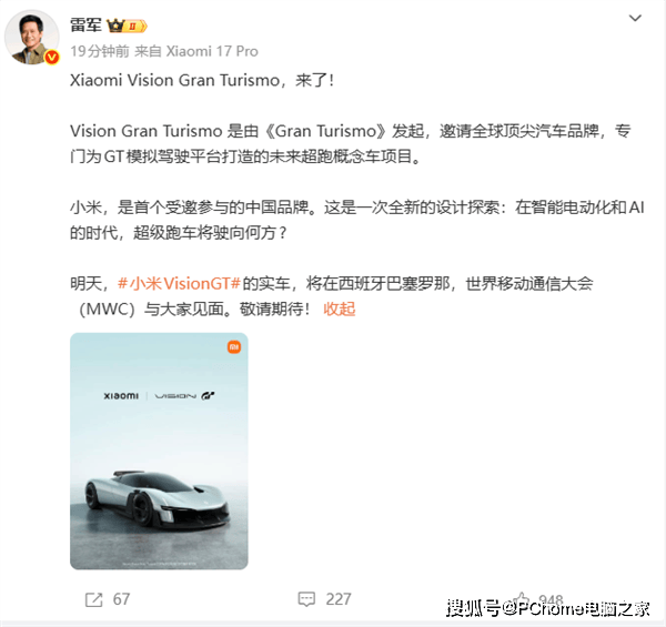 小米集团创始人、董事长兼CEO雷军近日通过社交平台宣布,小米首款Vision Gran Turismo实车将在西班牙巴塞罗那MWC展会期间完成全球首秀。此前,小米已在巴塞罗那举办的全球发布会上率先公开了该车型的概念设计图,引发行业高度关注。