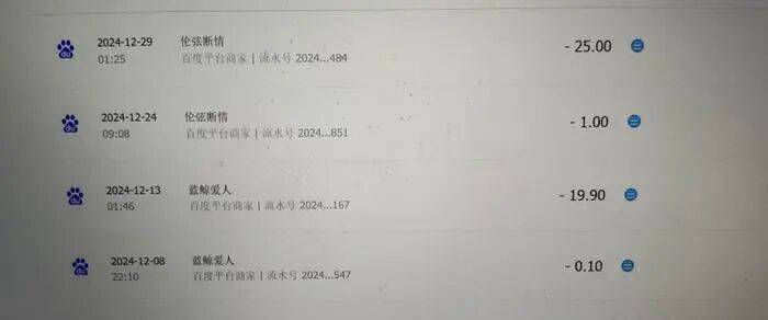 根据张先生提供的支付记录,2024年12月8日,老人在名为“蓝鲸爱人”的百家号博主处支付了0.1元,五天后系统自动扣款19.9元;12月24日,又在另一名博主“伦弦断情”处支付1元,五天后再次自动续费25元。此后,系统持续自动扣款,截至2025年1月,累计金额达540元。老人直至近期发现支付宝账户余额从1000余元骤减至不足百元,才向家属说明情况。