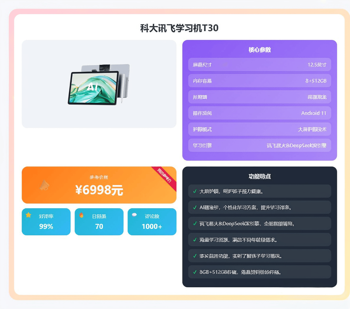 作为品牌技术集大成者,T30 Pro搭载最新一代AI精准学系统,实现从数理化知识点诊断到语文英语作文批改的全学科覆盖。该机型配备13英寸护眼屏,通过德国莱茵TÜV低蓝光认证,支持256GB存储空间与16GB运行内存。其麦克风阵列采用8+1声学设计,确保口语评测时能精准捕捉发音细节。这款产品主要面向预算充足且追求极致体验的家庭,其核心价值在于将AI技术深度融入教学场景,例如通过语义分析实现作文批改的个性化建议,或利用知识图谱构建个性化学习路径。