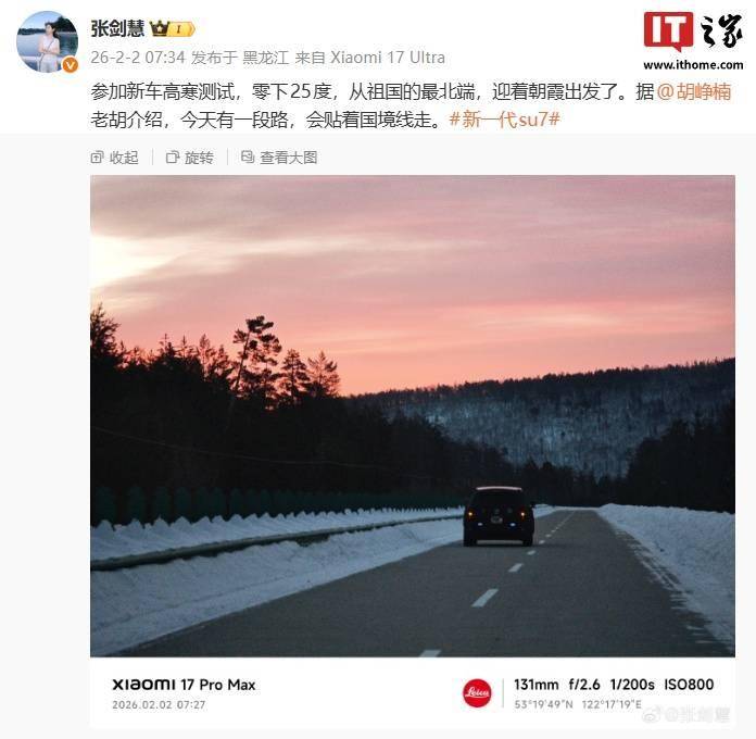 小米集团副总裁张剑慧同日通过社交媒体透露,她正在参与新车的高寒环境测试。据其描述,测试路线有一段将沿着国境线行驶,并分享了车辆动态画面,其中车内小蓝灯的亮起状态成为关注焦点。这一细节或与车辆智能交互系统的调试有关。