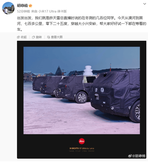 近日,顺为资本投资合伙人胡峥楠在社交平台发布了一组伪装测试车的照片,引发了汽车行业的广泛关注。照片中的四台SUV测试车身披重度伪装,正在极寒环境下进行测试。胡峥楠在配文中透露,测试车队从漠河一路行驶至黑河,全程七百多公里,在零下二十五度的低温中穿越大小兴安岭,为的是“好好试一下‘都在等着的车’”。