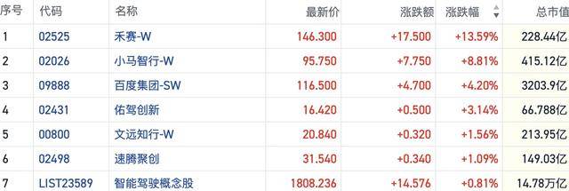 港股智驾概念股今日集体上扬,激光雷达与自动驾驶解决方案供应商成为市场焦点。截至盘中交易时段,禾赛科技(02525.HK)股价涨幅突破13%,小马智行(02026.HK)紧随其后上涨近9%,百度集团(09888.HK)等产业链相关企业同步走强,板块整体呈现量价齐升态势。