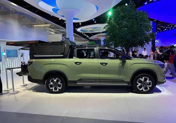 全球首发的中大型新能源皮卡雷达RD8是本次车展焦点之一。基于吉利SEA浩瀚架构打造,定位“豪华户外出行旗舰皮卡”,填补国内中大型新能源皮卡市场空白。外观设计采用“极简硬派”风格,车身线条平直硬朗,大尺寸六边形封闭式格栅内部为参数化点阵式LED光源,科技感强烈;分体式大灯组上半部分为贯穿式LED日间行车灯,下半部分为矩阵式LED远近光灯,支持自适应远近光、转向辅助等功能;车身侧面配备22英寸多辐式轮毂、原厂越野AT轮胎、电动侧踏、全景天窗等配置,货箱采用碳纤维复合材料打造,轻量化且耐用,内部配备锚点、导轨、电源接口等实用配置;车尾竖置LED尾灯与电动尾门设计,尾门支持感应开启与角度调节,使用便捷性大幅提升。车身尺寸方面,长宽高分别为5680mm×2000mm×1935mm,轴距3400mm,货箱尺寸1520mm×1800mm×500mm,容积1.37立方米,可轻松容纳露营装备、越野工具等物品;车内采用5座布局,前排座椅支持8向电动调节+4向lumbar支撑调节,后排座椅靠背角度可调,腿部空间两拳以上,乘坐舒适性出色。