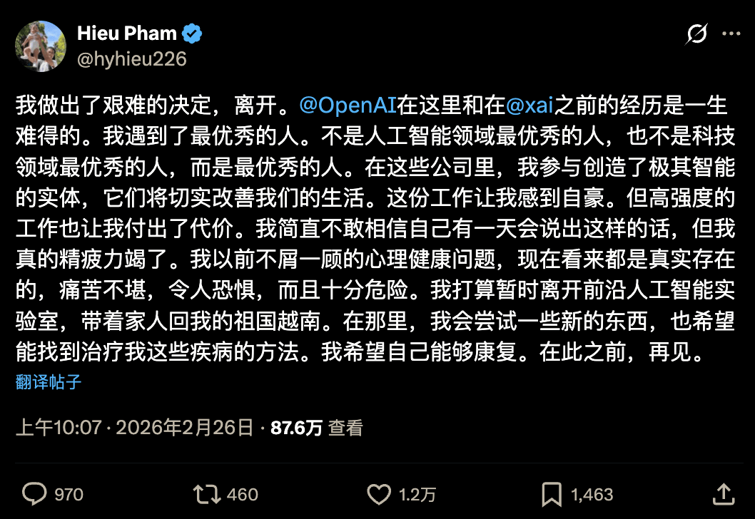 一场由顶尖人才集体出走引发的行业震荡,正在硅谷人工智能领域悄然蔓延。当OpenAI工程师Hieu Pham在社交平台宣布辞去职务、携家人返回越南时,这场持续数年的高压危机终于撕开了最后一层遮羞布。这位曾代表斯坦福大学征战全球编程大赛、在CMU攻读机器学习博士的精英,用"痛苦、可怕、极度危险"形容自己的精神状态,直言需要"寻找治愈病症的方法"。